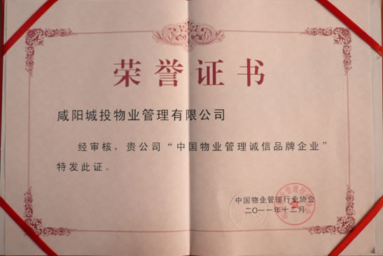 中國物業(yè)管理誠信品牌企業(yè)證書