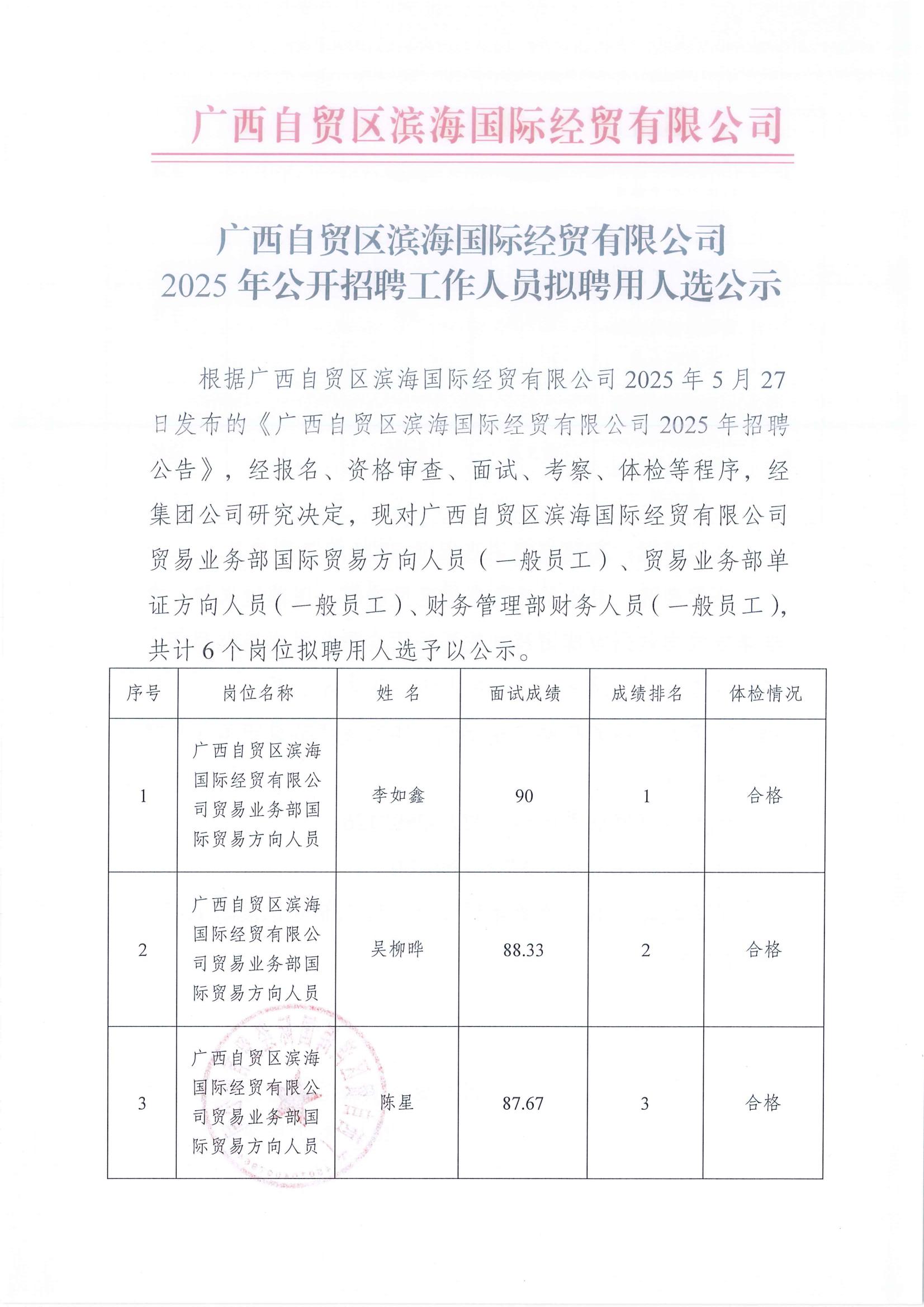 廣西自貿(mào)區(qū)濱海國(guó)際經(jīng)貿(mào)有限公司2025年公開招聘工作人員擬聘用人選公示