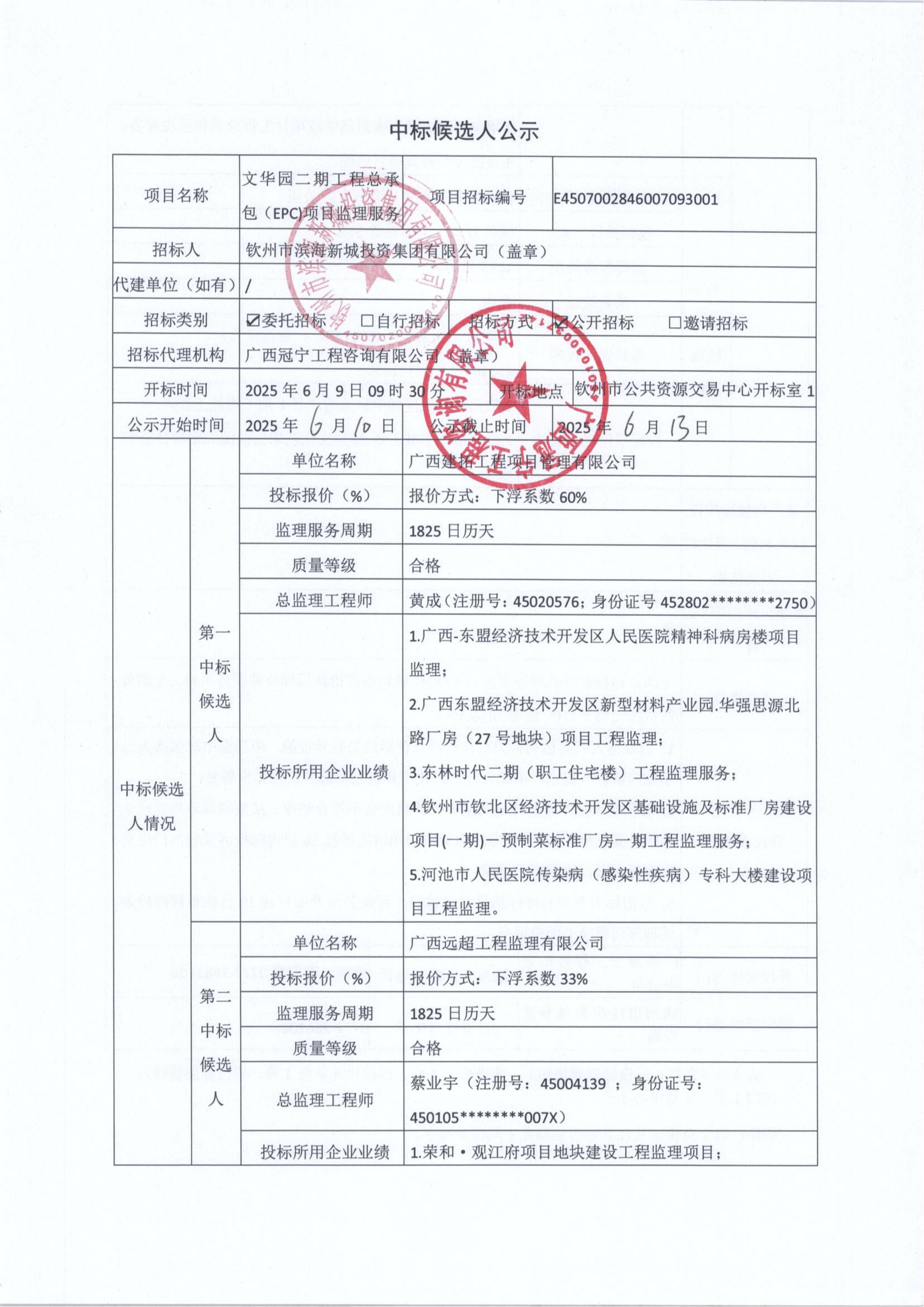 文華園二期工程總承包(EPC)項(xiàng)目監(jiān)理服務(wù)中標(biāo)候選人公示