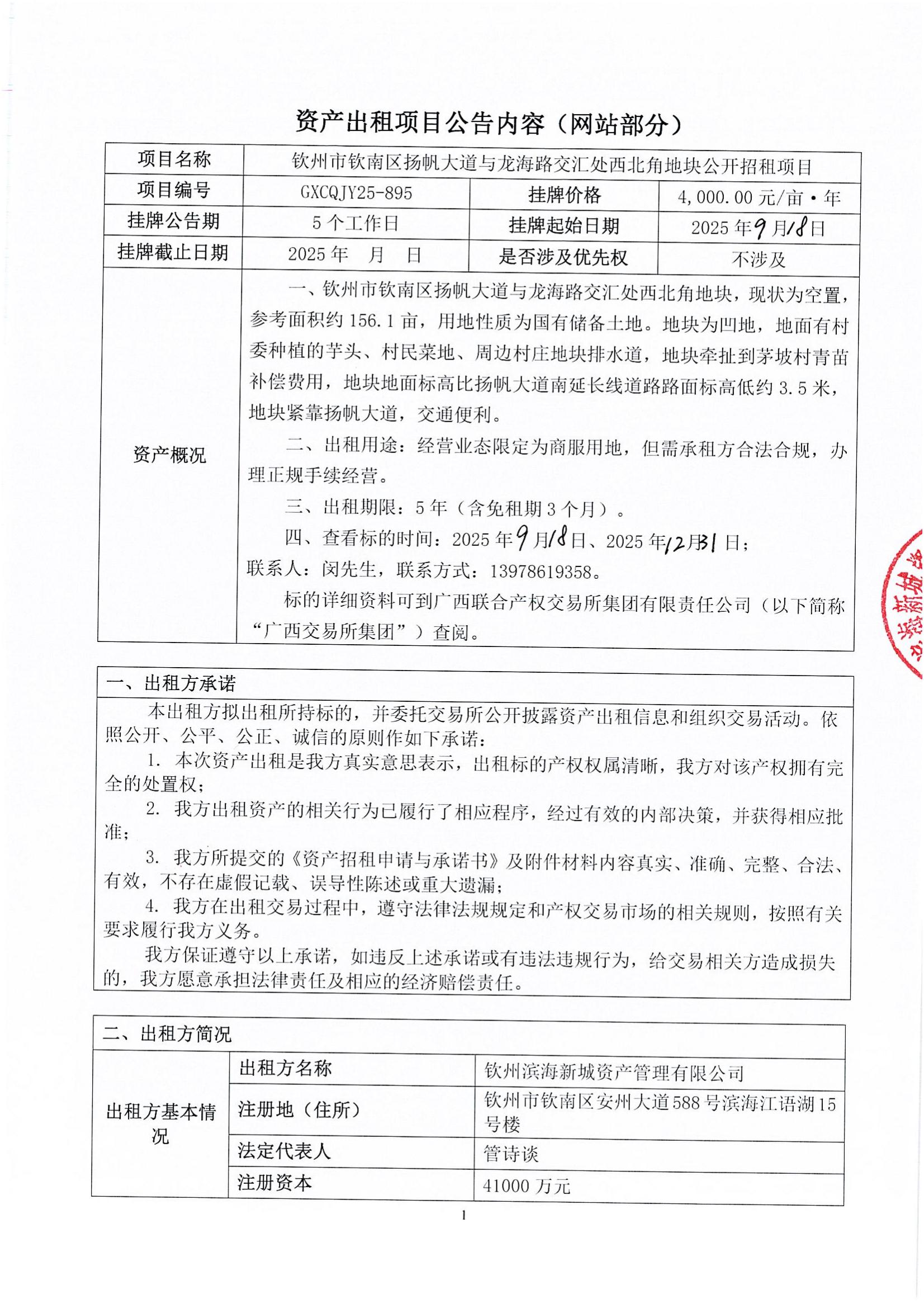 欽州市欽南區(qū)揚(yáng)帆大道與龍海路交匯處西北角地塊公開招租項(xiàng)目