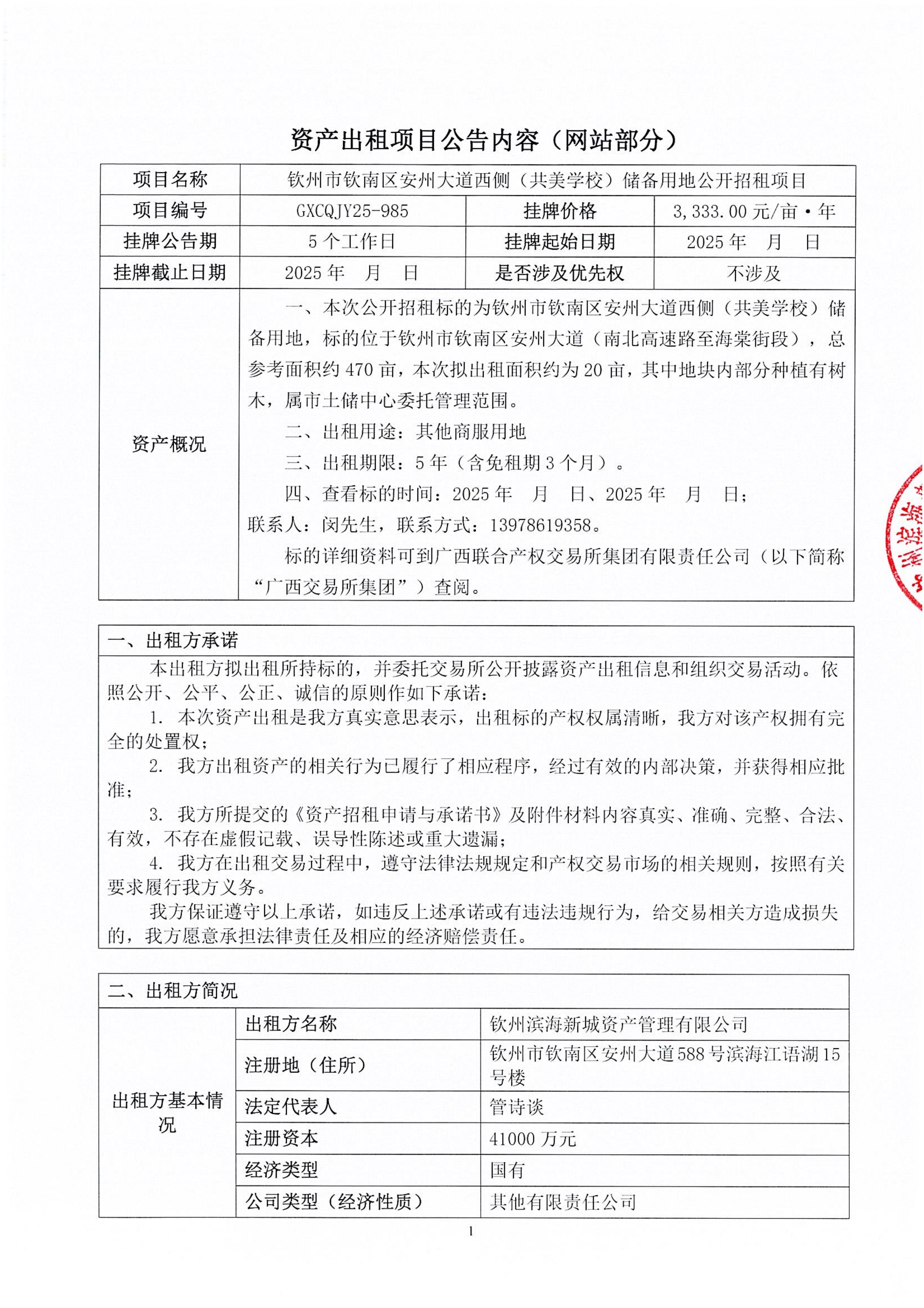 欽州市欽南區(qū)安州大道西側(cè)(共美學(xué)校)儲(chǔ)備用地公開招租項(xiàng)目