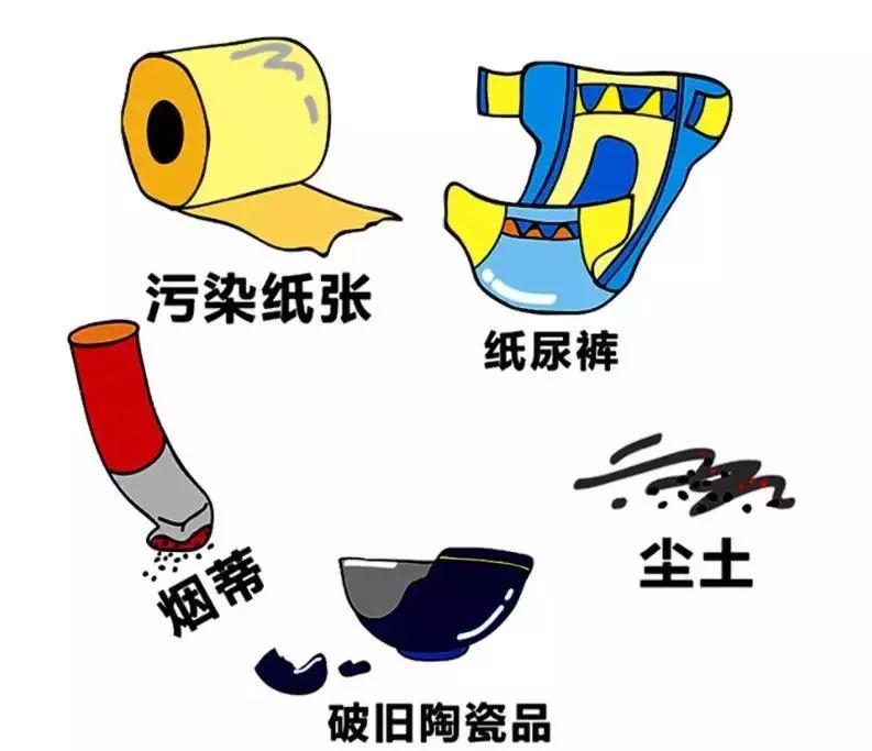 指除有害垃圾、廚余垃圾、可回收物之外的其他廢棄物,包括廢棄食品袋(盒)、一次性餐具、廢棄保鮮膜(袋)、廢棄紙巾、廢棄瓶灌、灰土、煙頭、寵物糞便等。