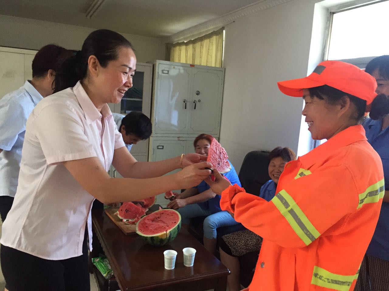 當(dāng)日上午,總經(jīng)理趙明海、工會主席常紅艷等人一行來到河南街、安谷苑、九冶、城投時代進行慰問,向一線職工送去800余斤西瓜。慰問組每到一處,親切詢問保安保潔的生活情況和工作狀況,叮囑他們要注意防暑降溫,并對保安保潔近期以來的勤懇勞動表示感激和關(guān)懷之情,叮囑他們在開展“創(chuàng)文”整治工作以來,保潔員隊伍人員少、天氣熱、任務(wù)重的情況下,在提高小區(qū)環(huán)境質(zhì)量的同時,要做好遮陽等保護措施,注意勞逸結(jié)合,預(yù)防中暑。