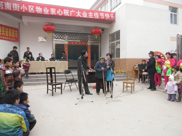 。ㄐ畔T:李建華)農(nóng)歷正月十三(2月4日),河南街小區(qū)鑼鼓喧天,彩旗招展,熱鬧非凡,呈現(xiàn)出一片祥和的節(jié)日氣氛。 上午10時聯(lián)歡會準時開演,小區(qū)業(yè)主自編自演的腰鼓舞、扇子舞、拉開了這次活動的序幕,他們以優(yōu)美、歡暢的舞姿,以矯健穩(wěn)定的舞步,揮舞著手中的彩帶與鼓錘,生龍活虎,時伏時起。精彩的表演,贏得了在場觀眾的陣陣掌聲,尤其是小品《遲到的紅梅》將聯(lián)誼會逐漸推向了高潮,詼諧幽默地方話臺詞、真情再現(xiàn)的感情留露,深深的感染著在場的每一位觀眾。同時也讓我們清醒的認識到,尊老愛幼的傳統(tǒng)美德,無論在什么時候,我們都應該繼承與發(fā)揚,理解與關愛自己身邊的長輩與老人。 通過這次聯(lián)誼會,不但拉近與改善了物業(yè)與業(yè)主的關系,也活躍了小區(qū)精神文化生活,同時也體現(xiàn)了物業(yè)與小區(qū)業(yè)主都是一家人的魚水之情,鼓舞了物業(yè)辦全體員工繼續(xù)搞好小區(qū)各項工作的信心。